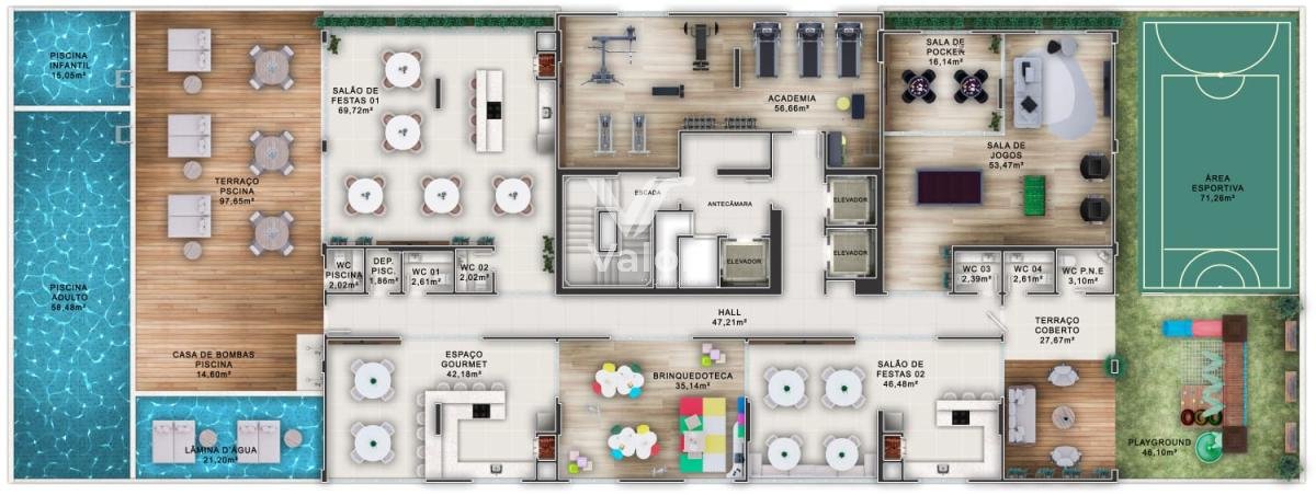 Área de lazer completa com piscinas adulto e infantil
